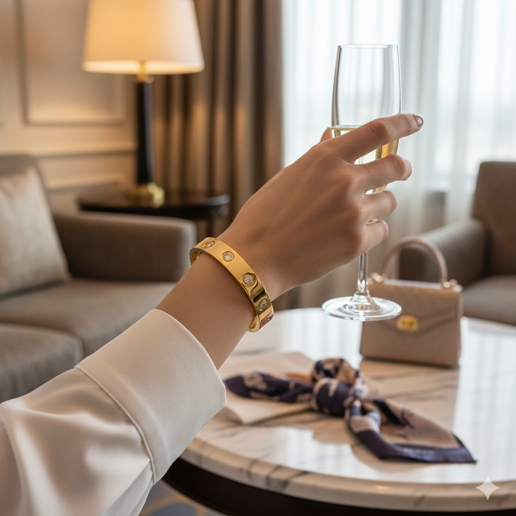 The love bracelet concept emerged from 1970s Parisian jewelry design, where the idea was to create a piece that symbolized commitment—jewelry you wouldn't take off. The original versions required a screwdriver, making the act of wearing it a statement of devotion. Modern interpretations like this capture that spirit of permanence in a more accessible, everyday design.